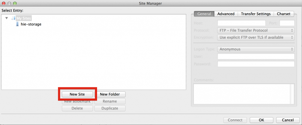 Click the ‘New Site’ button and name the new site ‘hie-storage’