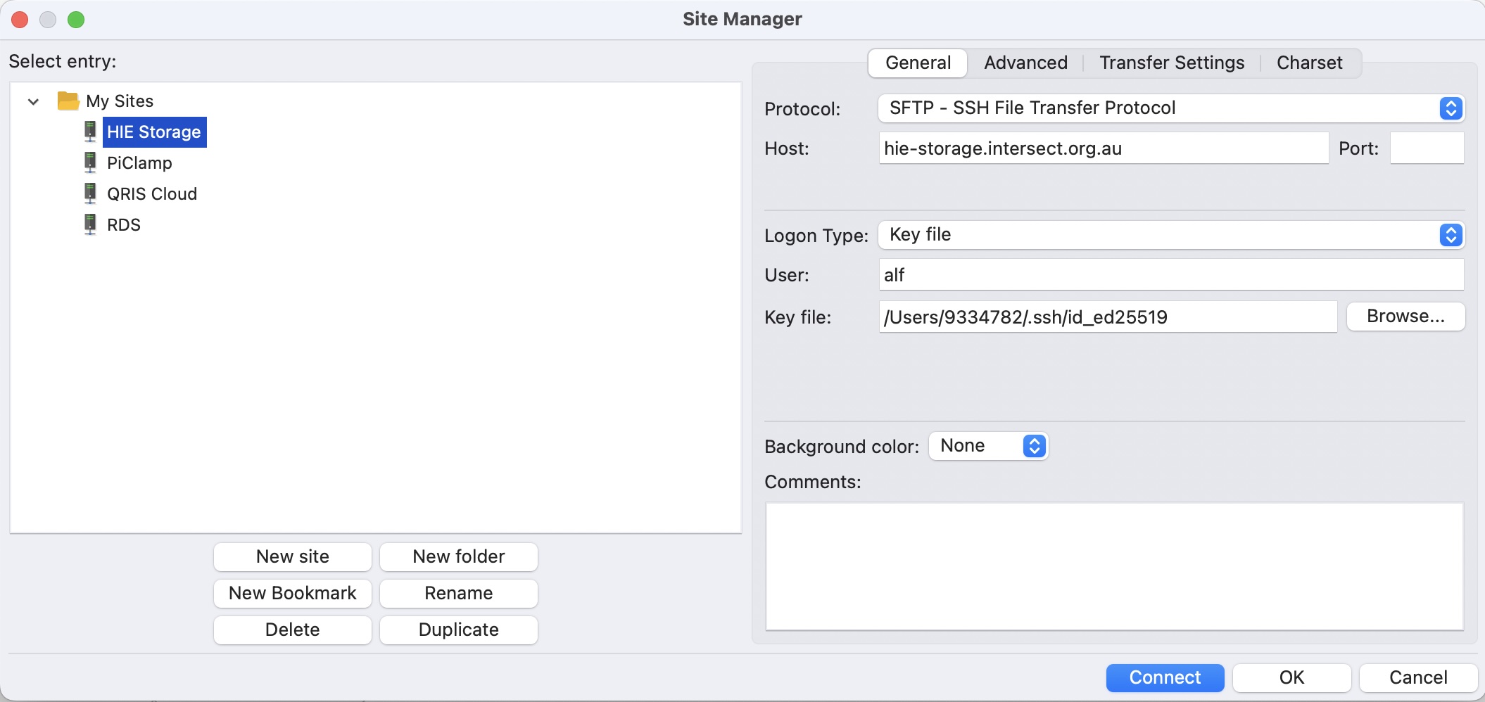 With the new ‘hie-storage’ site selected in the left panel, fill out the following details in the ‘General’ tab on the right panel